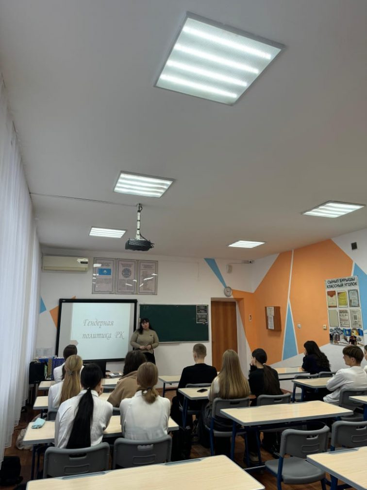 Сабақта жоғары сынып оқушыларыме млекеттік гендерлік саясаттың негізгі қағидаттары мен, ерлер мен әйелдер үшін теңқұқықтар мен мүмкіндіктердің маңыздылығы мен, сондай-ақ гендерлік зорлық-зомбылық тыңалдын алуға бағытталған іс-шаралар мен танысты.