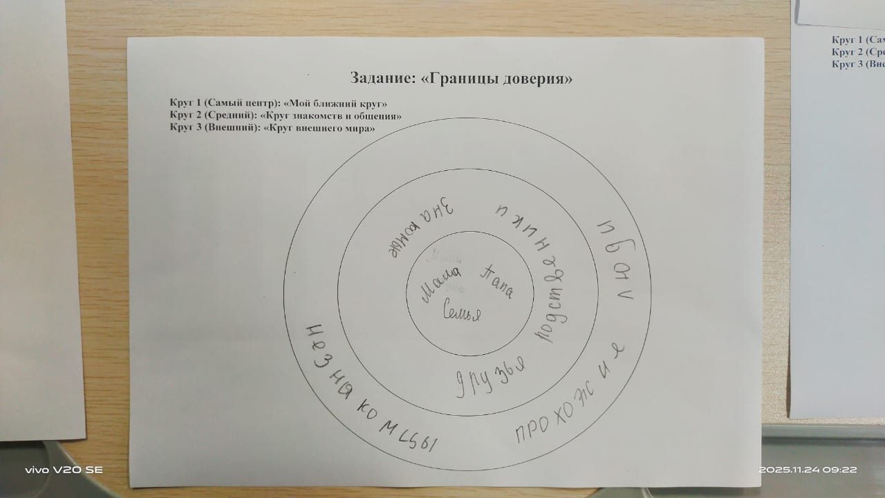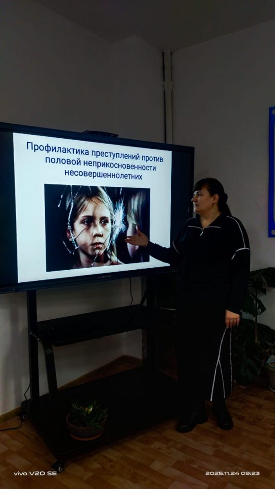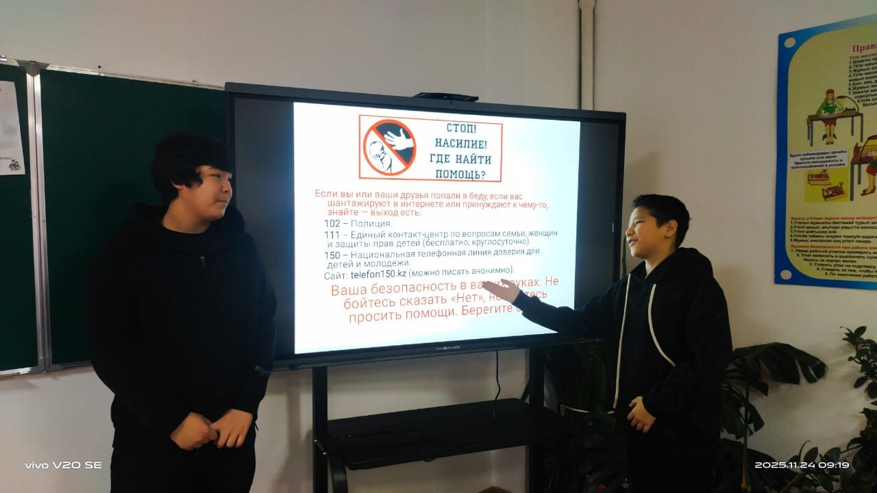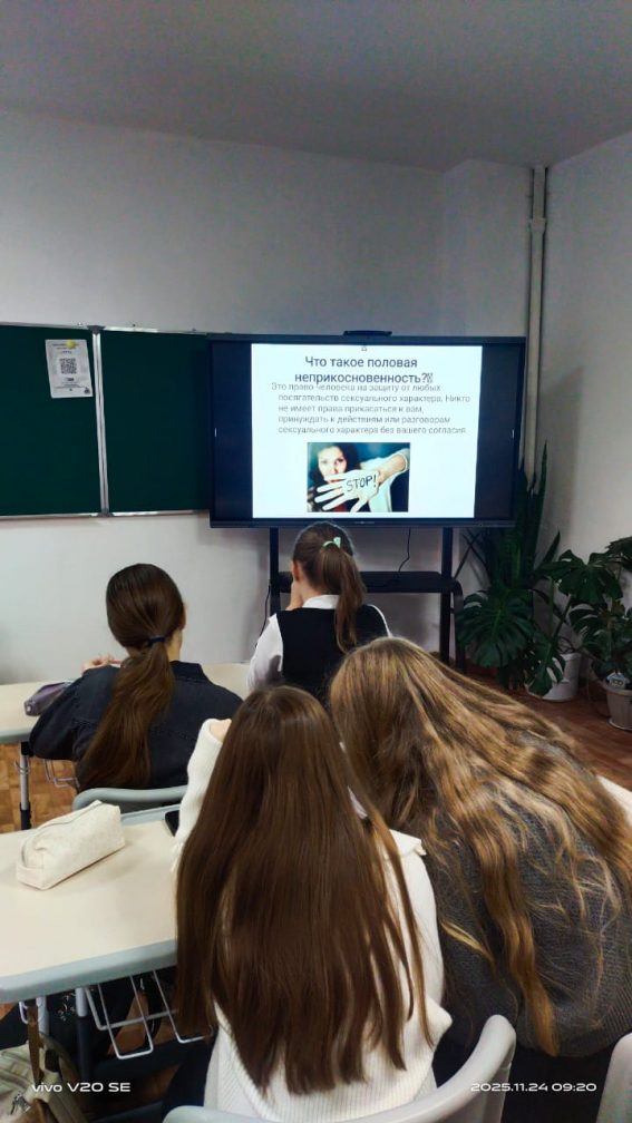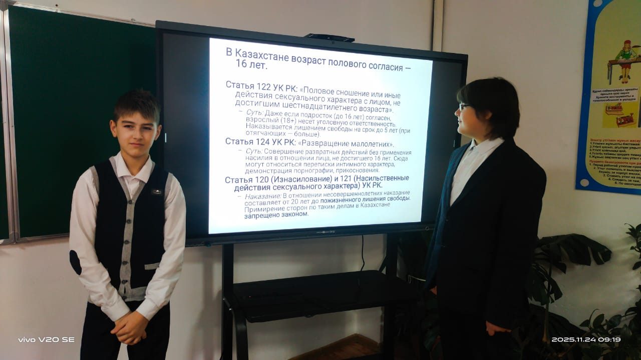 2025 жылғы 24 қараша күні 8 «В» сыныбында «Жыныстық қол сұғылмаушылыққа қарсы жасалатын қылмыстардың алдын алу» тақырыбында сынып сағаты өтті. Әңгіме балалардың құқықтарының бұзылуына жол бермеу, сондай-ақ осындай сипаттағы құқық бұзушылықтардың алдын алу және қоғамдық тәртіпті қамтамасыз ету мақсатында өткізілді. Сынып сағатты 8 «В» сыныбының сынып жетекшісі Внучкова Наталья Викторовна өткізді.