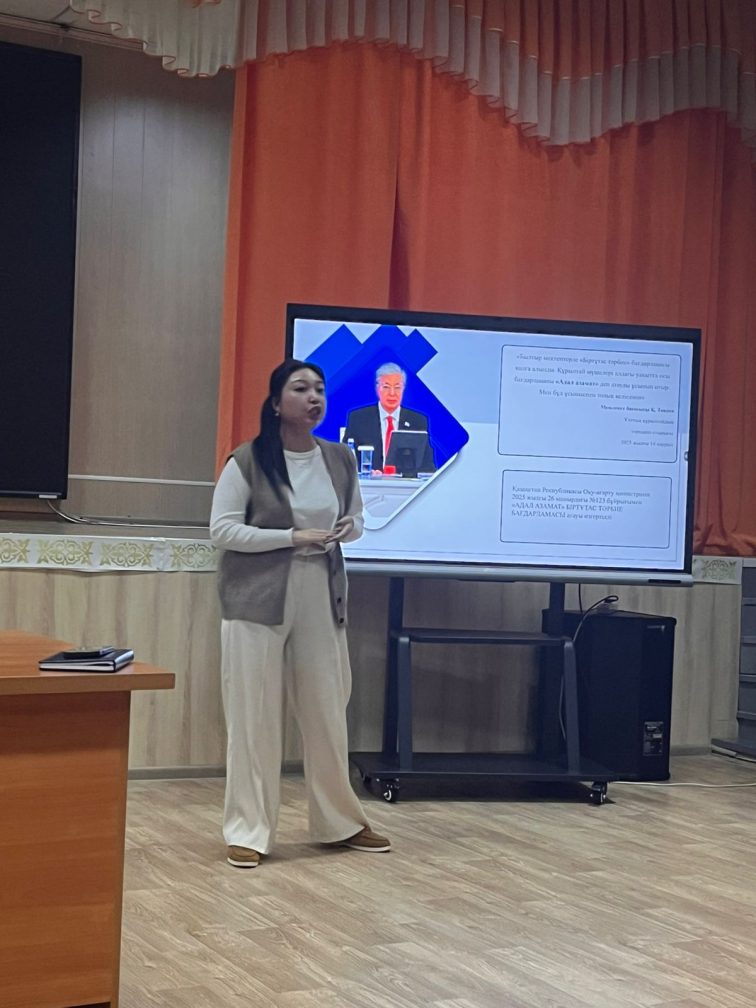 Мектеп директорының ТЖ жөніндегі орынбасары А.А. Амержанова –«Адал Азамат» бір тұтастәрбие бағдарламасы мен таныстыру бойынша сөз сөйледі.