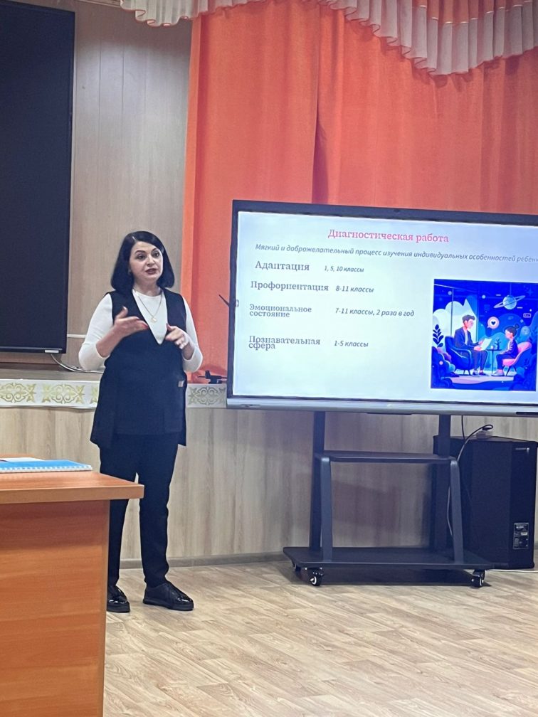 Мектептің педагог-психологы О.М. Середа - ата-аналарды психологиялық қызметтің жұмысы және оқушыларға көрсетілетін психологиялық қолдау жөнінде хабардарету бойынша сөз сөйледі.