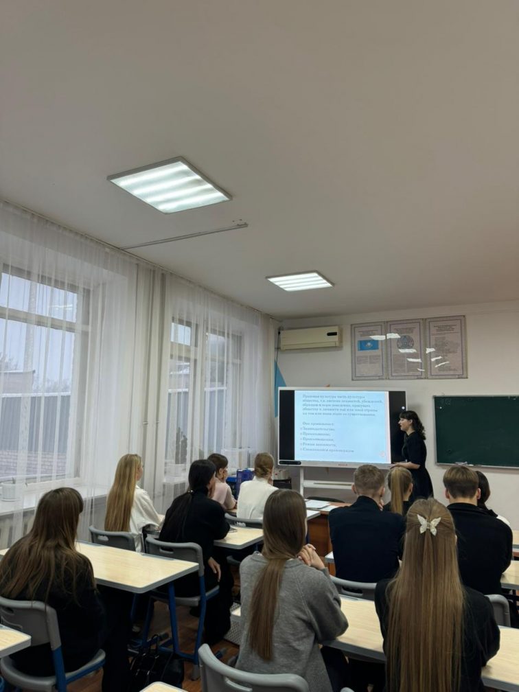 Сынып сағаты барысында білім алушылар қоғам өміріндегі құқықтық мәдениеттің маңызын талқылап, құқық бұзушылық мысалдары мен олардың салдарын қарастырып, заңды сақтауға байланысты өмірлік жағдайларды талқылауға қатысты.