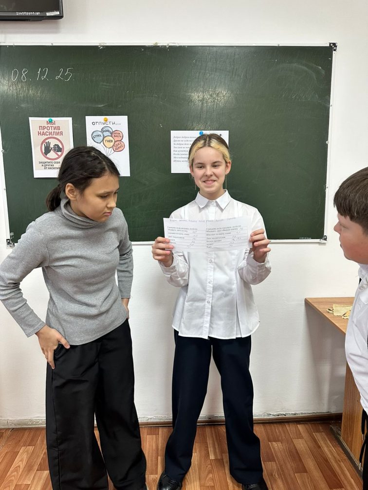 Акция аясында 8 желтоқсан күні 6«Б» сыныбында «Біз зорлық-зомбылыққа қарсымыз» атты сынып сағаты өтті. Сабақ барысында оқушылар зорлық-зомбылық түрлерін талқылады, дауларды агрессия дана жыратуды үйренді, бейбітқарым-қатынас жасаудың жолдарын және бір-біріне құрметпен қараудың маңызын түсінді. Сонымен қатар, қиын жағдайларда көмексұр аудыңқа жеттілігі және проблемамен жалғыз қалмаудың мәні ерекше ата пөтілді.