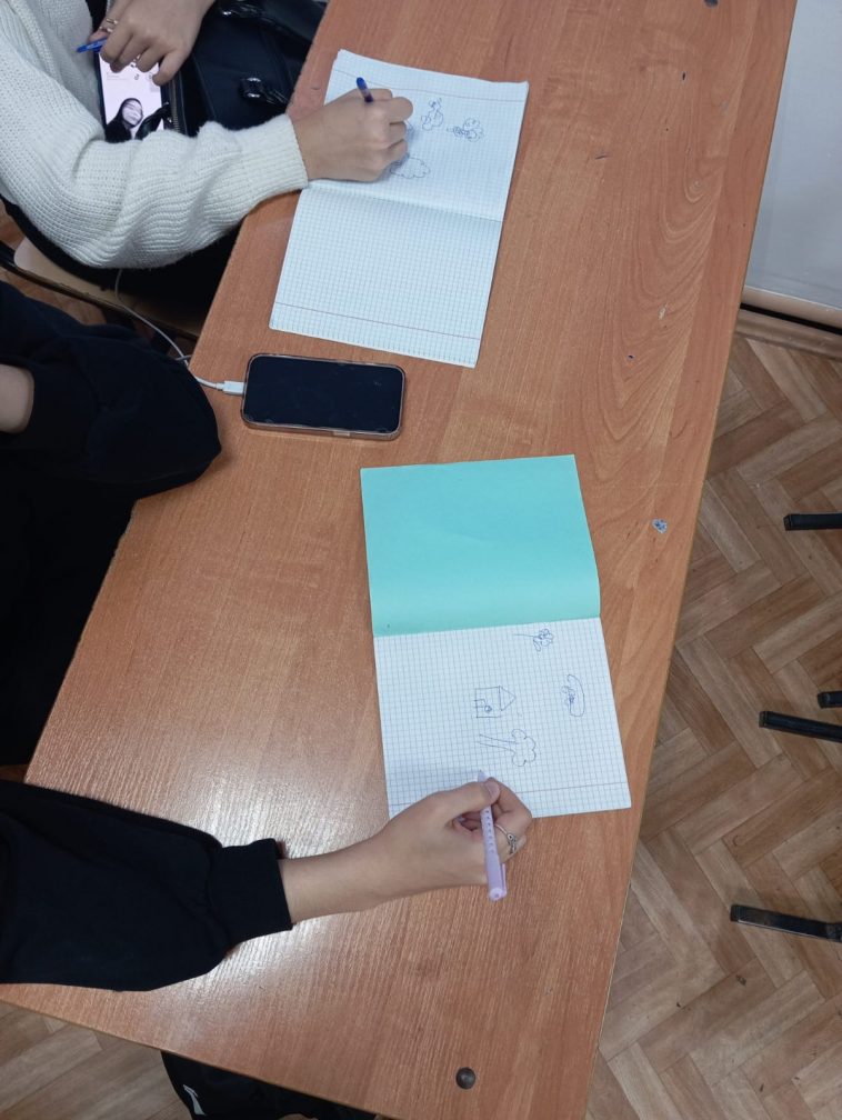 Сонымен қатар практикалық жаттығу өткізілді: білім алушыларға көздерін жұмып тұрып альбом парағына сурет салу ұсынылды. Тапсырманы орындағаннан кейін оқушыларға кері байланыс үшін сұрақтар қойылды: