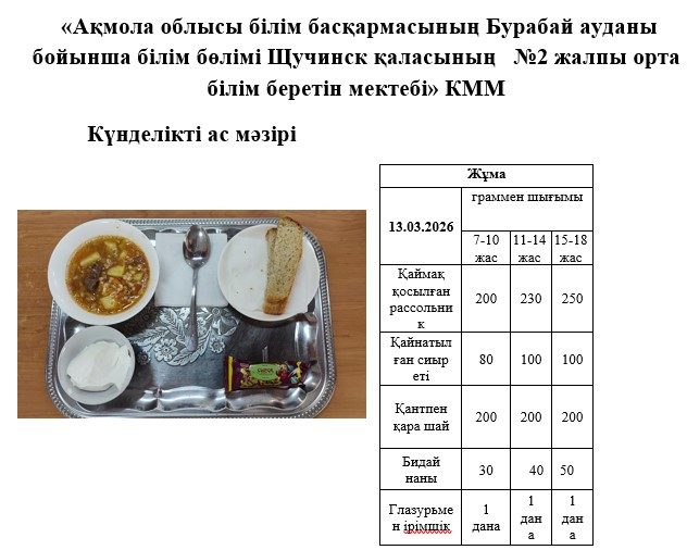 13.03.2026 жарналған күнделікті мәзір