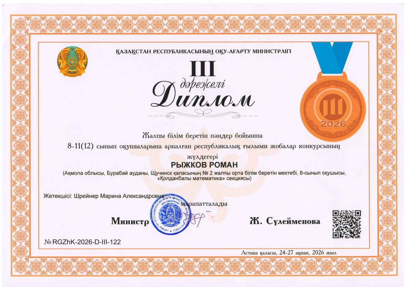 Сіздерге жоғары кәсібилігіңіз, педагогикалық шеберлігіңіз және жүлдегердің сапалы дайындығыңыз үшін алғыс айтамыз. Сіздің қолдауыңыз мен тәлімгерлігіңіз оқушының әлеуетін ашуға және республикалық деңгейде елеулі нәтижеге қол жеткізуге көмектесті.