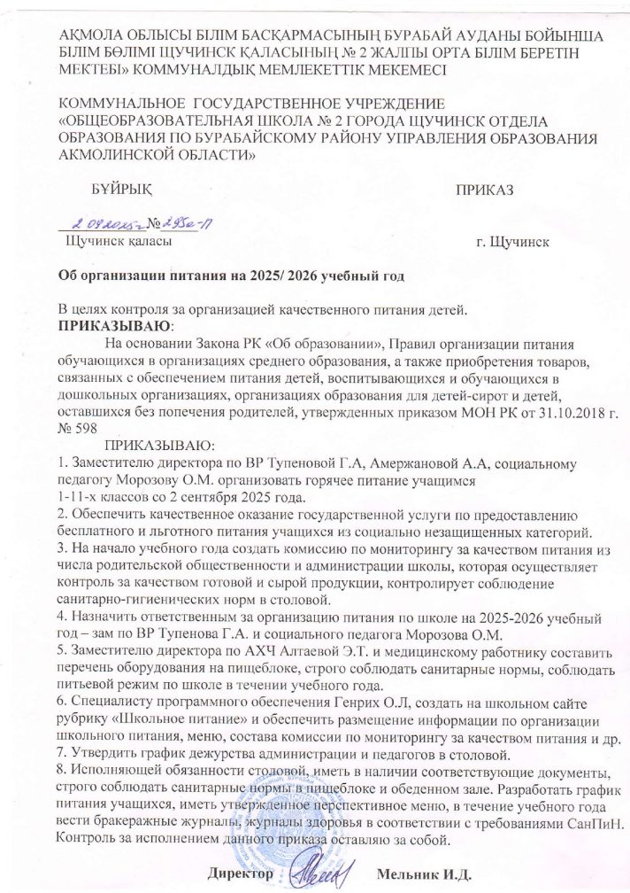 2025-2026 оқу жылына тамақтануды ұйымдастыру туралы