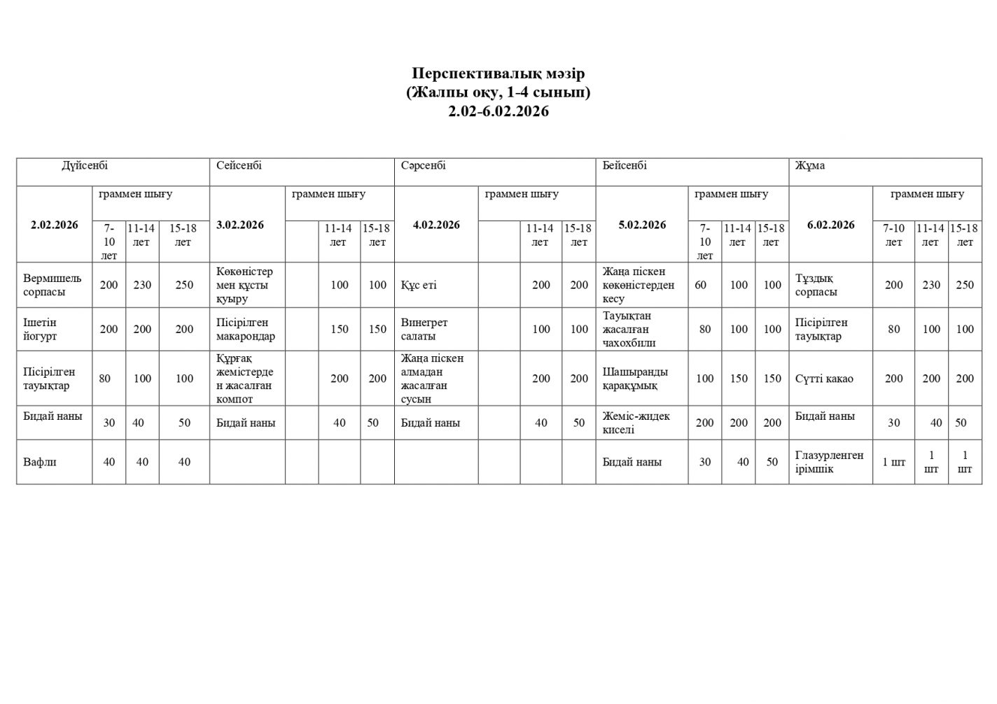 Болашақ мәзір 02.02. - 06.02.