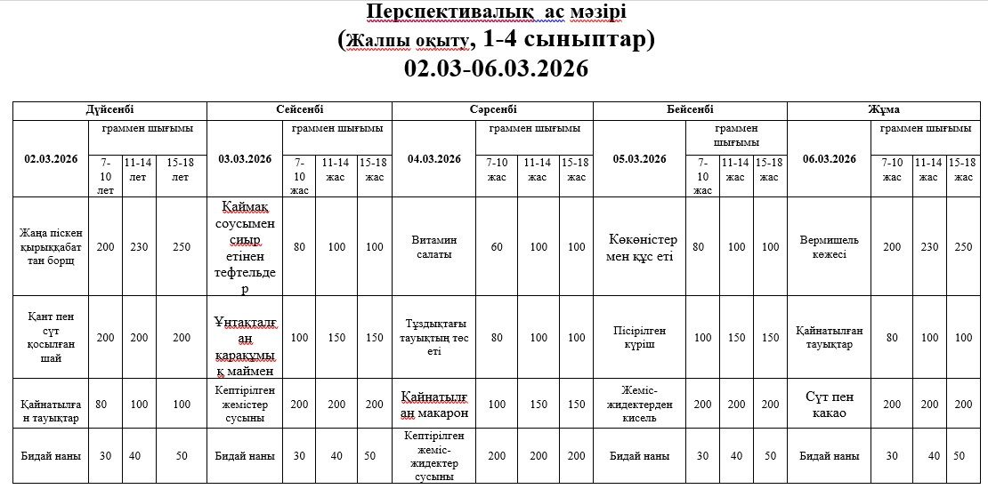 Перспективалық ас мәзірі (Жалпы оқыту, 1-4 сыныптар) 02.03-06.03.2026