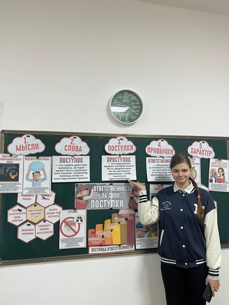 Сынып сағаты барысында жасөспірімдер арасындағы құқық бұзушылықтардың негізгі себептері, олардың салдары, сондай-ақ заңнамада көзделген жауапкершілік шаралары қаралды. Оқушылар талқылауға белсенді қатысып, өз пікірлерін білдірді және қоғамдағы тәртіп пен заң нормаларын сақтаудың маңыздылығы туралы қорытынды жасады.