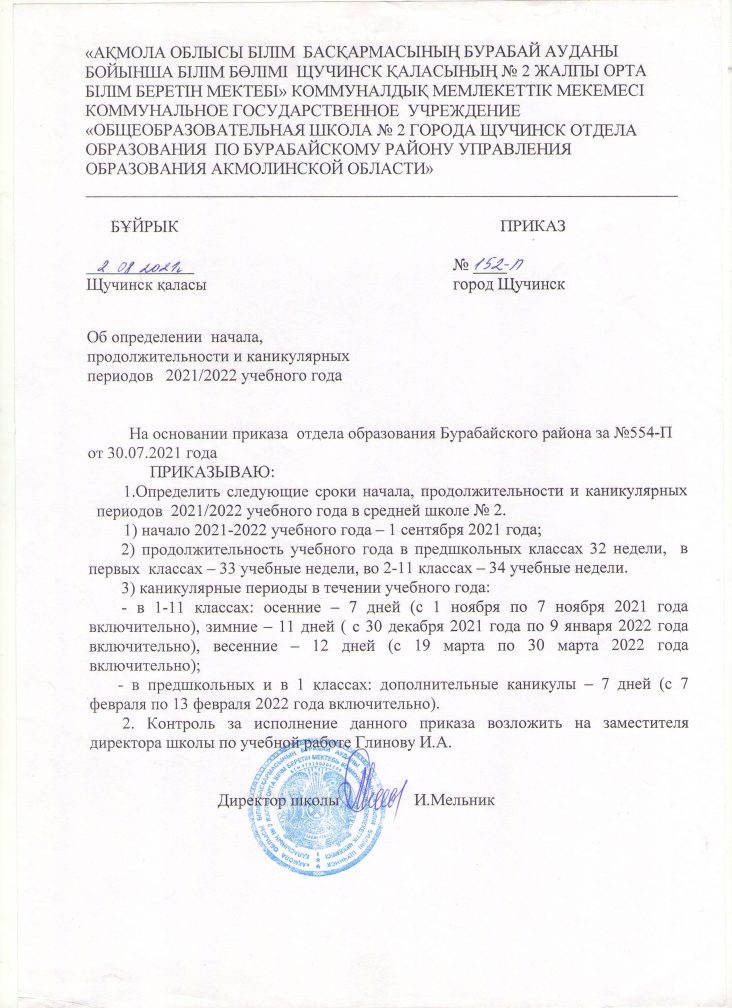 2021-2022 оқу жылының басталуын, ұзақтығын және каникул кезеңдерін айқындау туралы бұйрық