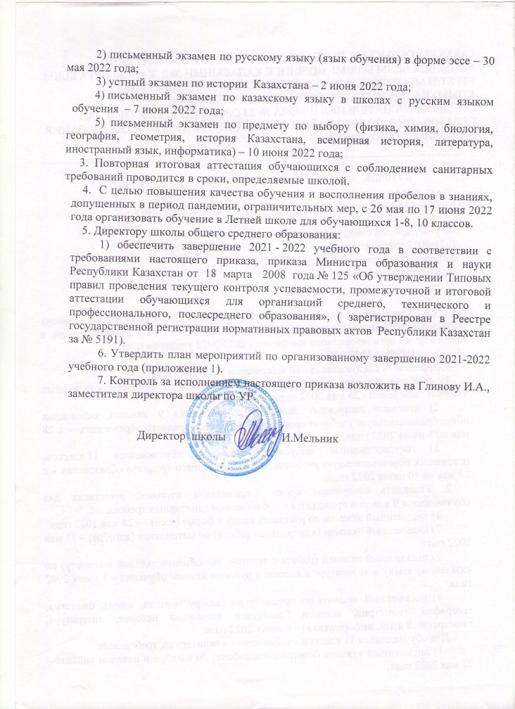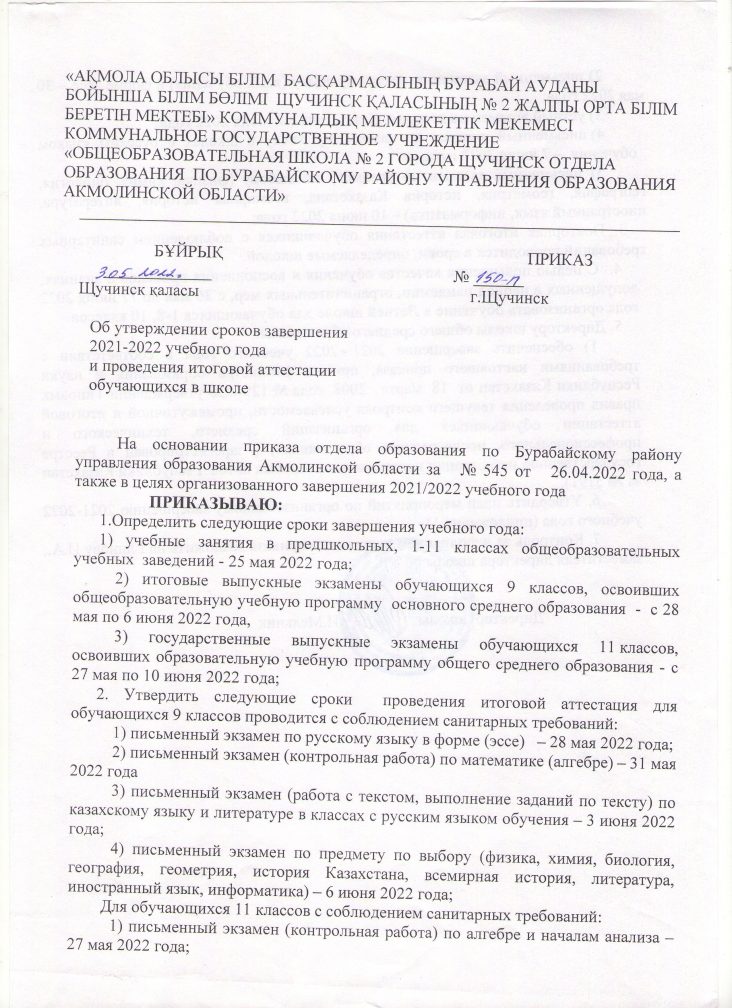 2021-2022 оқу жылының аяқталу мерзімдерін бекіту туралы бұйрық