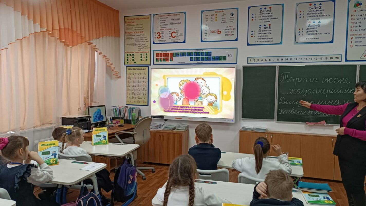 Іс-шара барысында оқушылар тақырыптық мультфильмдердің үлгісінде Бала құқықтары туралы конвенцияның негізгі ережелерімен танысты. Қараудан кейін балалар сұрақтарға белсенді жауап берді, батырлардың әрекеттерін талқылады, құқықтар мен міндеттерді ажыратуға, сондай-ақ өз әрекеттері үшін жауапкершілік пен ережелерді сақтаудың маңыздылығы туралы қорытынды жасауға үйренді.